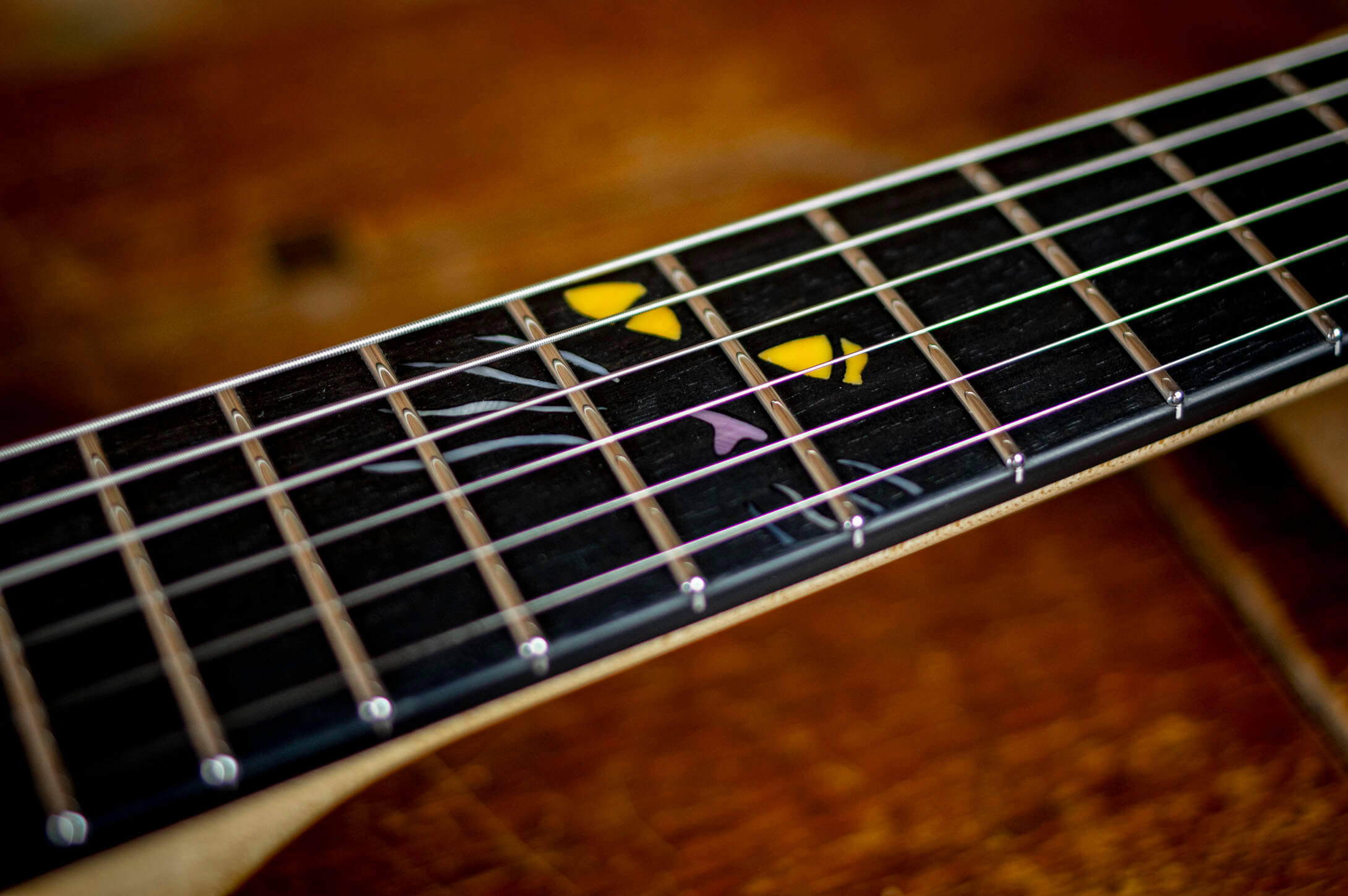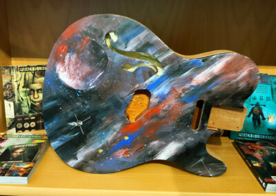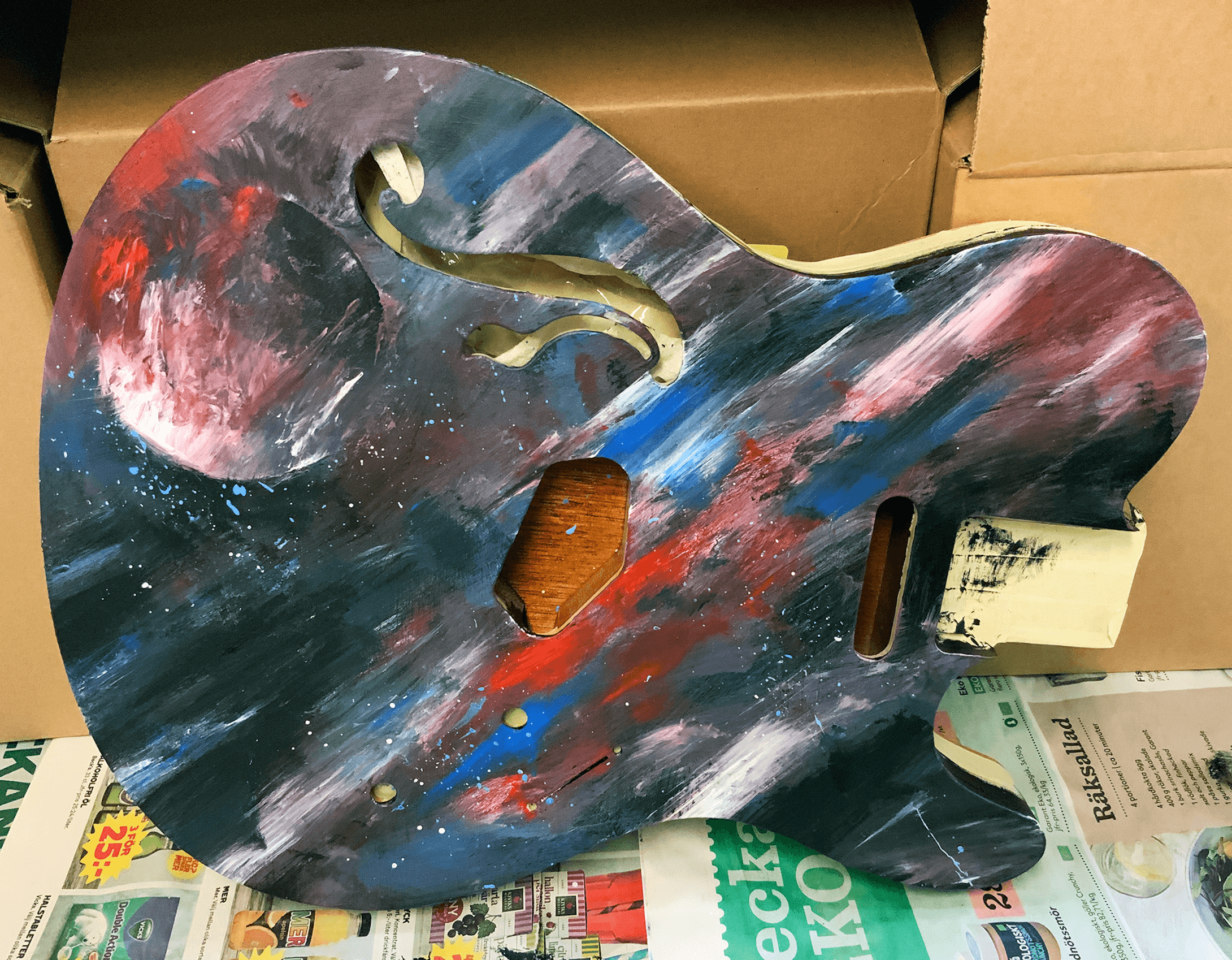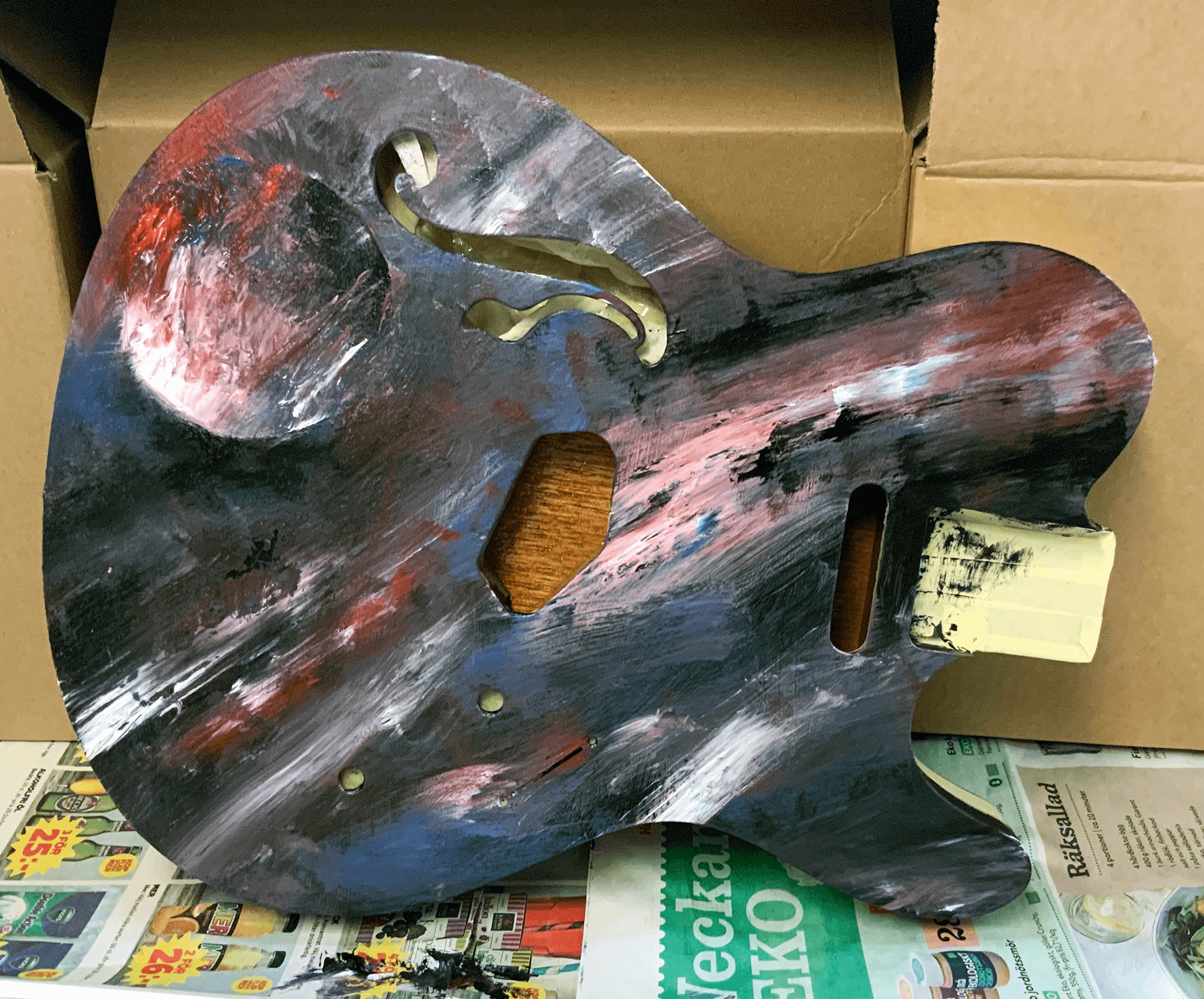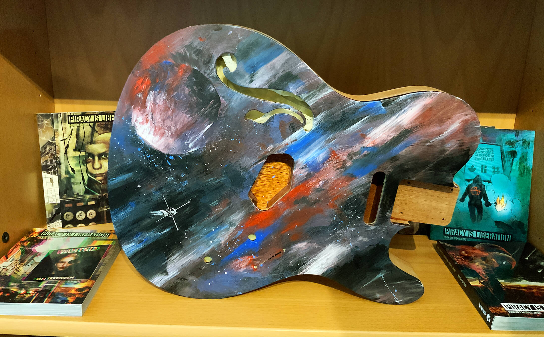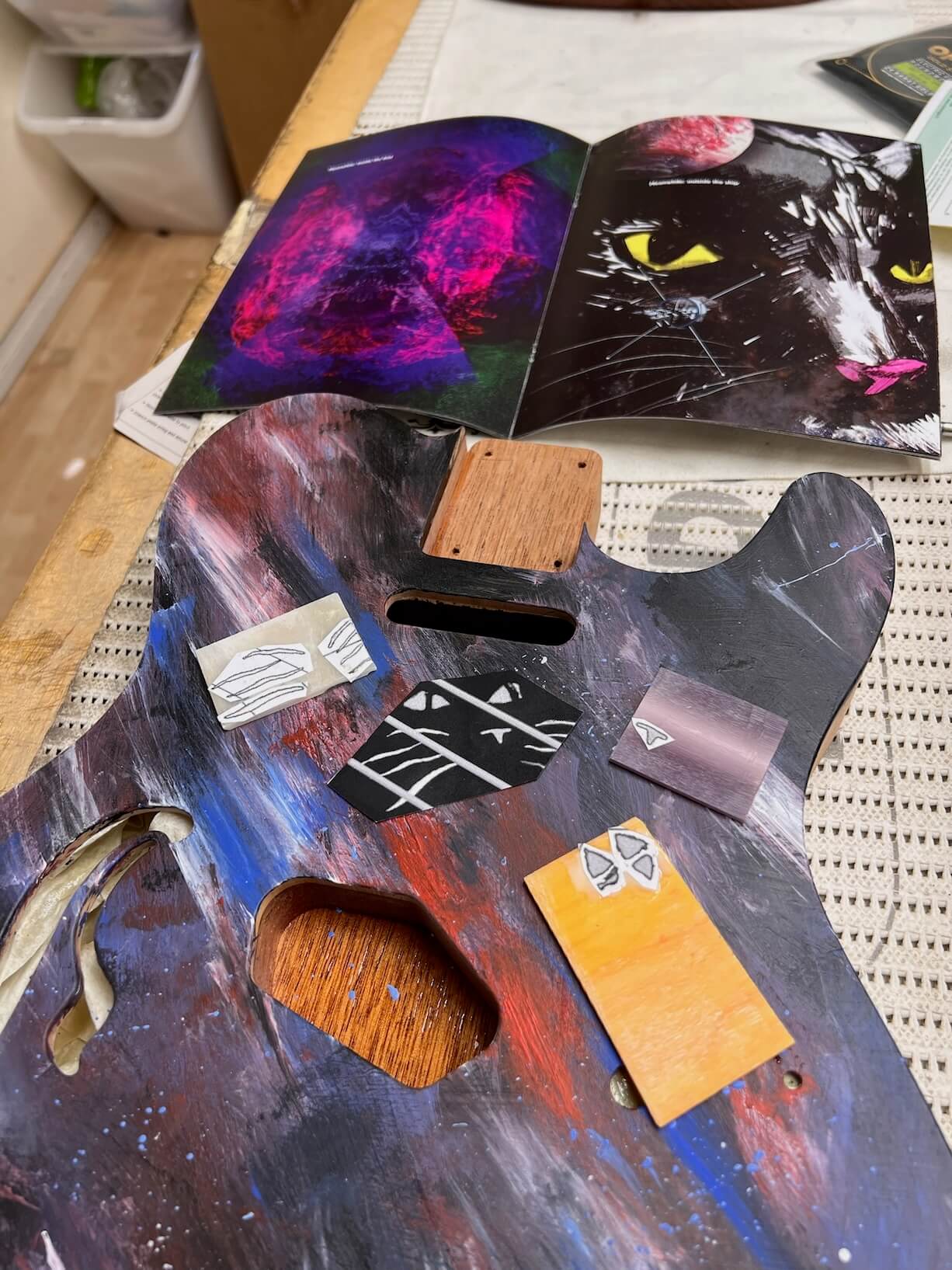 Once Juha saw the painted body and read the related comic, his first thought was: “We have to have the cat of the story in the guitar too!”